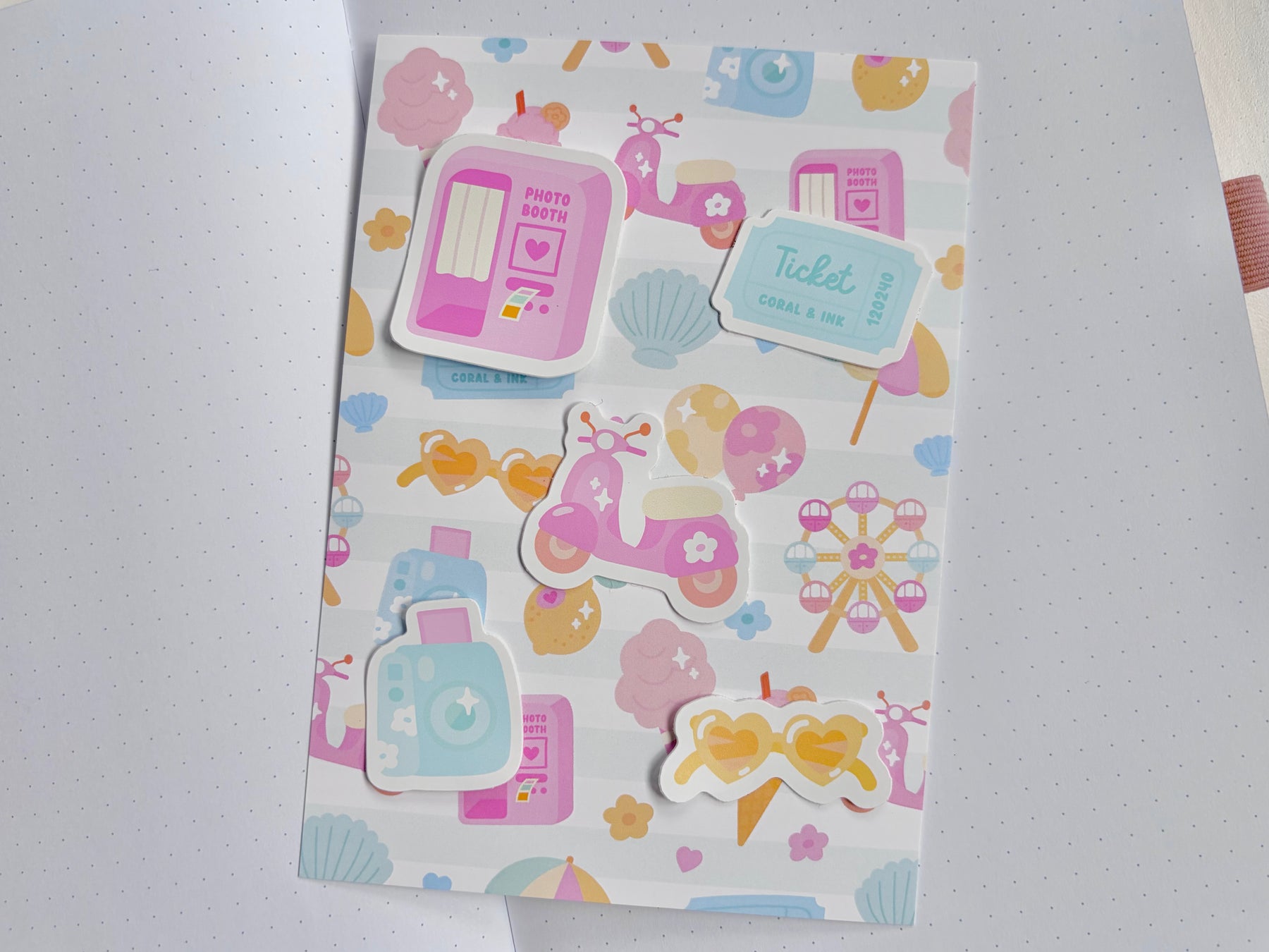 The set features 5 adorable mini stickers, a pink moped, a fair ticket, sunglasses, an instant camera and a Photo Booth.