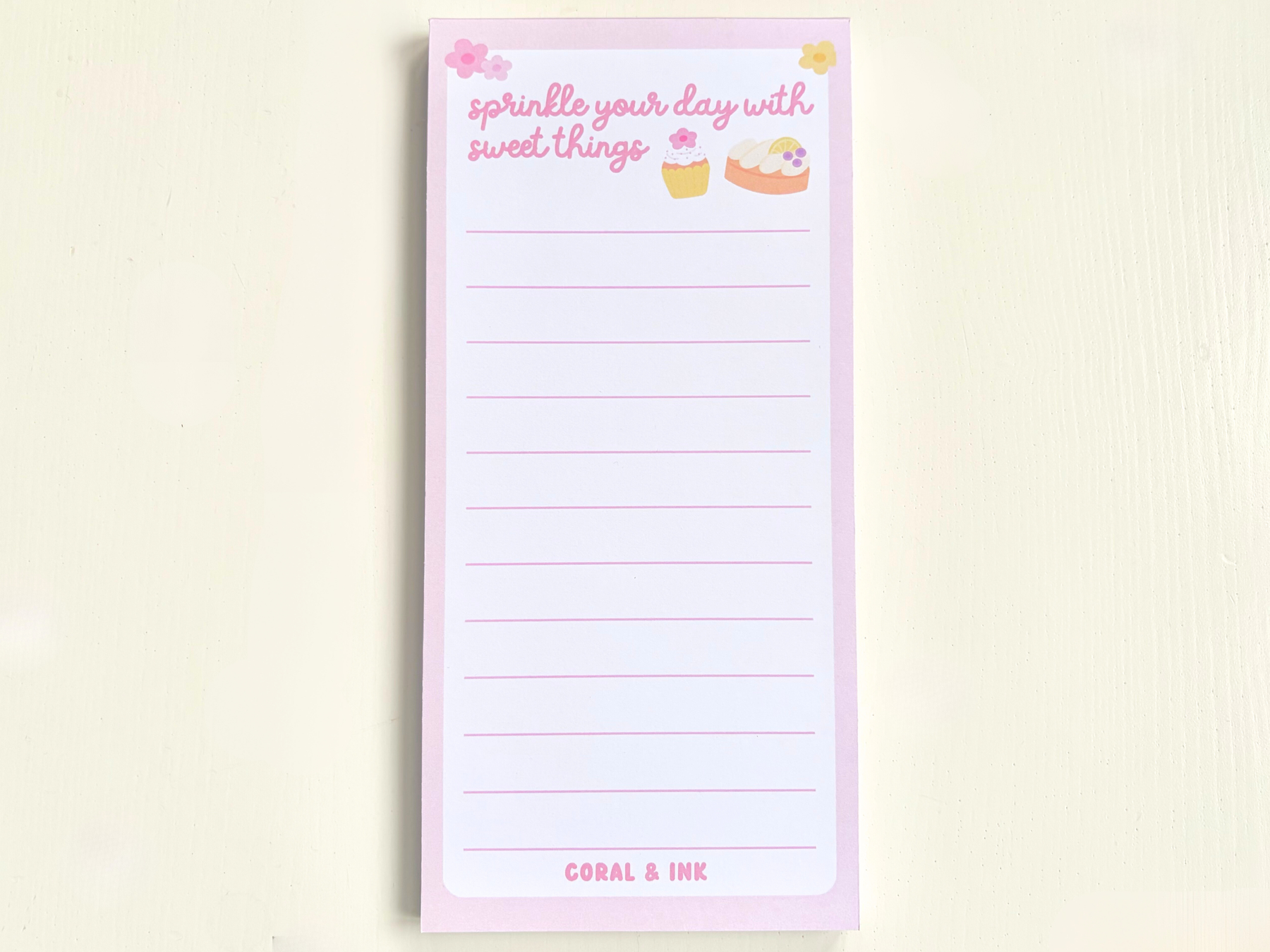 The notepad features the quote 'Sprinkle Your Day With Sweet Things' alongside some cute flowers & sweet treats at the top.